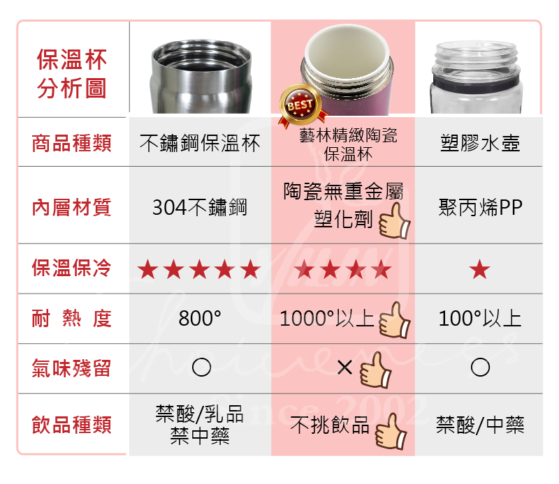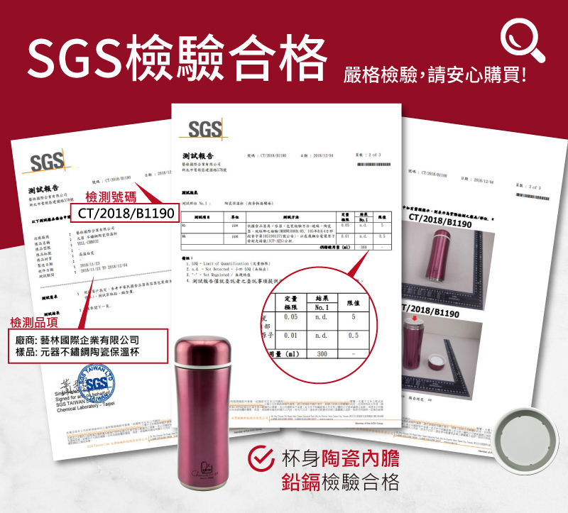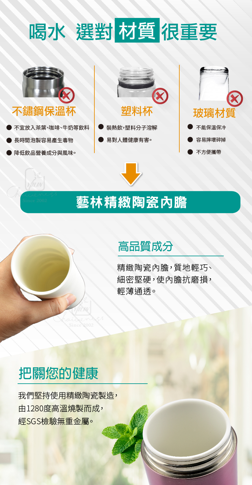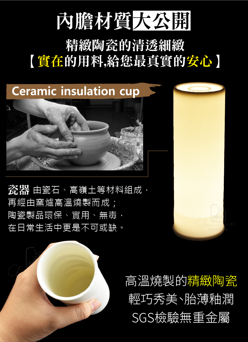 所以使用陶瓷保溫杯是健康的趨勢,除了什麼飲品都可以裝之外,它還很好清潔,不容易殘留異味,我們的保溫杯是原廠正品,每一支都經過嚴格SGS檢驗,請消費者安心購買。