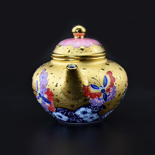 同時繪製五隻蝴蝶圍繞於壺身,寓意為”五福臨門”。
