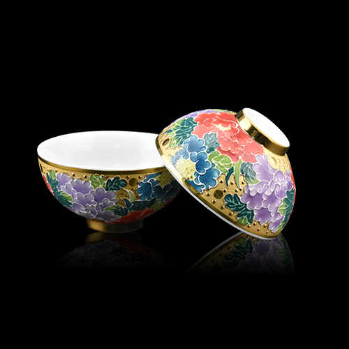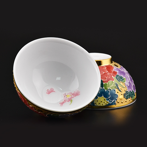 杯身填滿牡丹花圖樣,富貴牡丹,朵朵綻放,花開富貴,富貴滿滿。杯面採用德國12K真金繪出如意紋。